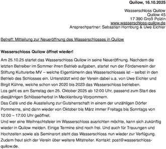Am 25.10.25 startet das Wasserschloss Quilow in seine Neueröffnung. Nachdem die letzten Betreiber im Sommer ihren Betrieb aufgaben, startet nun der Förderverein der Stiftung Kulturerbe MV – welche Eigentümerin des Wasserschlosses ist – selbst in den Betrieb des Schlosses ein. Unterstützt wird der Verein dabei u.a. von Uwe Eichler und Birgit Kühne, welche schon von 2020 bis 2023 das Wasserschloss betrieben.