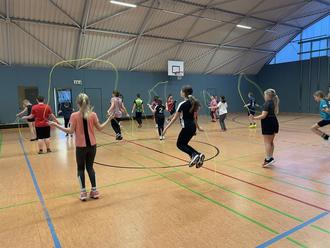 Im Januar nahm unsere Grundschule erneut am Präventionsprojekt „Skipping Hearts“ teil. Schwerpunkt war ein zweistündiger Basiskurs zum „Rope Skipping“, der von einer angeleiteten Workshopleiterin durchgeführt wurde. Dieser Kurs bot eine Vielzahl von Sprungvarianten mit dem Springseil, sowohl für Einzel-, Paar- als auch Gruppenübungen. In diesem Jahr nahmen 30 Schülerinnen und Schüler der Klassen 4a und 4b teil. Nach den erlernten Seilsprüngen gab es eine Vorführung, hierzu begrüßten wir die Klassen 2a und 2b als Zuschauer. Die Freude motivierte alle Schüler und es gab die Gelegenheit, die gesehenen Sprünge selbst auszuprobieren.