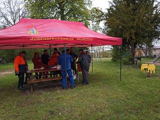 Auf Grund des Nieselregens wurde die freiwillige Feuerwehr Murchin angefragt, ob sie nicht einen Pavillion aufstellen kann, um Speis und Trank zum Ende der Arbeit nicht unter freiem Himmel zu verzehren.
