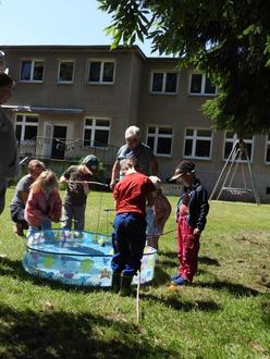 Ein besonderer Höhepunkt war das große Kuchenbuffet, das von den Eltern und Großeltern der Kinder liebevoll vorbereitet wurde. Bei Kaffee, Tee, Saft und einer bunten Auswahl an selbstgebackenen Kuchen sowie Obstplatten konnten sich die Gäste stärken und gemütlich ins Gespräch kommen. Bunte Spiel- und Bastelstationen luden zum Mitmachen ein: Ob beim Dosenwerfen, Flaschenkegeln oder Traumfänger basteln. Enkel und Großeltern hatten sichtlich Spaß daran, Zeit miteinander zu verbringen. Besonders beliebt war das Entenangeln. Mit einer Stockrute mit Wollfaden und Magneten konnten aus einem mit Wasser befüllten kleinen Schwimmbecken bunte Enten geangelt werden.