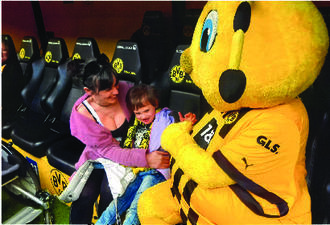 Kiara Sophie Wondrejz aus Lobkevitz macht Bekanntschaft mit dem BVB-Maskottchen „Emma"