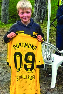 Flottille. Alle Teilnehmer waren voll des Lobes über diesen Programmpunkt und auch der Wanderleiter Dieter hob das große Interesse und das disziplinierte und geordnete Auftreten der Beteiligten hervor. In Dranske haben die Mitarbeiter des Dransker Kiosk alles für die Einnahme der Mittagsmalzeit nach vorheriger Bestellung vorbereitet. Es gab Bockwurst, Knacker und diverse Fischbrötchen. Auch das war eine Meisterleistung keiner musste lange warten. Der Besuch des Marinehistorischen- und Heimatmuseums Dranske fand dann etwas weniger Interesse, da einige von der Wanderung etwas platt waren. Am Nachmittag begannen die Feierlichkeiten auf dem Bakenberg. Während die Erwachsenen im Außenbereich der Musik von DJ Andreas lauschten, Gespräche führten und das reichhaltige Getränke - und Speisenangebot in Anspruch nahmen, gab es für die Inselborussen-Kids erstmalig ein extra Programm. Unter Anleitung von Susi konnte eine Bastelstraße besucht und ein Fußballturnier mit den Vätern durchgeführt werden. Ein Souvenierstand fand reges Interesse und für die Tombola konnten alle 1000 Lose verkauft werden. Da es wenig Nieten gab, füllten sich die Tische mit den gewonnenen Preisen. Eine Versteigerung mit wertvollen Artikeln führte zu hohen Geboten. Überglücklich und zu Tränen gerührt konnte Klaas Fleischer aus Dranske ein Trikot mit den Originalunterschriften der BVB- Spieler der Saison 2022/23 in Empfang nehmen, für das seine Eltern bei 300,- Euro den Zuschlag erhielten. Ein gemeinsames Gruppenfoto am stürmischen Strand und zünftige Diskoklänge von D1 Andreas rundeten das gesamte Programm ab. Die 1000,- Euro vom Losverkauf wurden vom Verein zu gleichen Teilen an den Sonderfond Gruppenfahrten und das Spendenkonto für den 15-jährigen Paul, der bei einem Fußballspiel getötet wurde, überwiesen.