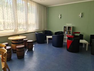 Das Kleinprojekt „Aufenthaltsraum“ entstand im Zusammenhang mit dem Schülercafé. Dazu wurde der Aufenthaltsraum der Schülerinnen und Schüler ebenfalls farblich zu den Fach- und Klassenräumen abgegrenzt. Er erhielt moderne Beleuchtung und verschiedene Sitzmöglichkeiten. Für Freistunden und nach dem Unterricht stehen verschiedene neue Spiele zum Ausleihen zur Verfügung. 1000 € erhielten wir über „Blitzprojekt“ vom Landkreis VR, Sitzmöglichkeiten vom Hotel „Am Wasser“ und kleine Tische wurden über den Schulverein gekauft.