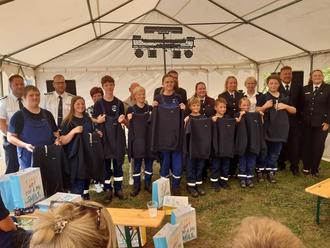 Mitglieder der Jugendfeuerwehr Dranske präsentieren stolz ihre neuen Pullover.