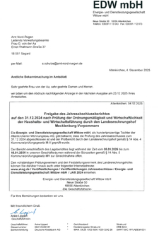 Die Energie- und Dienstleistungsgesellschaft Wittow mbH, als hundertprozentige Tochter der Altenkirchener Wohnungsbau AG, gibt bekannt, dass die Prüfung des Jahresabschlusses zum 31.12.2024 abgeschlossen ist und der Prüfbericht durch den Landesrechnungshof gemäß § 14 Abs. 4 Kommunalprüfungsgesetz M-V geprüft wurde.