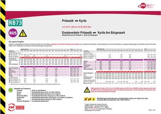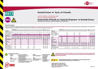 Bitte beachten Sie das vom 31.03. bis 13.04.2025 sowie vom 05.05. bis 30.06.2025 auf dem gesamten Abschnitt der RB73 zwischen Neustadt (Dosse), Kyritz und Pritzwalk Ersatzverkehr mit Bus stattfindet, Informationen dazu finden Sie in einem gesonderten Aushang!