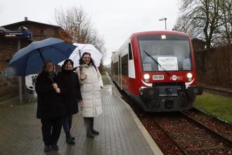 Die Kyritzer Bürgermeisterin Nora Görke, die Amtsleiterin für Bürgerservice, Bildung und Soziales Veronika Lausch und die Amtsleiterin für Stadtentwicklung und Bauen Melanie Füllgraf bestiegen am 27. Januar in Kyritz den Sonderzug "Berlin-Warnemünde-Express" (BWX) und warben so gemeinsam mit zahlreichen weiteren prominenten Fahrgästen sowie vielen Menschen an den Unterwegsbahnhöfen für den Erhalt und Ausbau der Regionalbahnstrecke Neustadt, Pritzwalk und Meyenburg und die Reaktivierung und Verlängerung dieser Bahnverbindung bis nach Güstrow und Rostock.