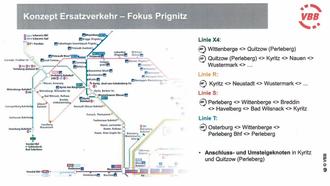 Das Ersatzkonzept auf der Straße baut auf diesem verdichteten Zugangebot auf. Kernstück des Ersatzverkehrs im Land Brandenburg ist die überregionale Linie X4, die von Wittenberge aus über Perleberg und den Verlauf der B5 mit Halt in Kyritz und Nauen nach Wustermark fährt. Von dort aus fährt sie weiter bis Brieselang, um die Gemeinde schnell an den Bahnhof Wustermark anzubinden. Dort ist jeweils mit kurzer Umsteigezeit in die Züge eine Weiterfahrt nach Berlin möglich.