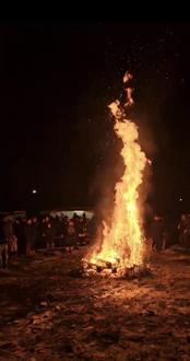 Rund um das Feuer entwickelte sich eine ruhige, offene Atmosphäre. Kinder bewegten sich spielend im Licht der Flammen, Erwachsene verweilten, tauschten Worte, hörten zu. Das Feuer knisterte, Funken stiegen auf, während der nächste Baum dem Feuer übergeben wurde. Der frisch gefallene Schnee, lange vermisst, knirschte unter den Schritten und verlieh dem Abend eine stille Selbstverständlichkeit.