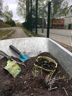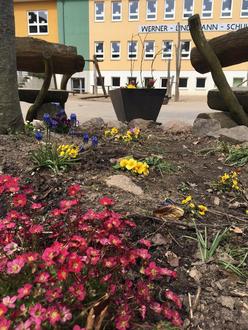 Mit Hilfe unserer Pfandsammelstelle konnte Leergut von SchülerInnnen für Frühlingszwiebeln, Stiefmütterchen und erste Samentüten genutzt werden. Der Schulinnenhof zeigt sich schon seit einigen Wochen mit bunten Farbtupfern.