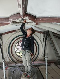 Restauratorin Daniele Geyer arbeitet an einer Deckenrosette