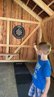 Gegenüber vom Dorfgemeinschaftshaus kann nun der neue Jugendtreff genutzt werden. Hier steht ein Dartspiel als Freizeitangebot bereit. Die Pfeile und eine Schutzmatte gibt es auch im Dorfladen zu leihen.