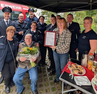 Das ist schon etwas ganz Besonderes und so machte sich eine Delegation der Feuerwehr auf den Weg nach Schwerin, um Hugo Dorendorf die Urkunde des Landesbrandmeisters und das Abzeichen zu überreichen. Unter musikalischer Begleitung mit dem Lied "Hurra, hurra, die Feuerwehr ist da" war er sichtlich zu Tränen gerührt und strahlte über das Gesicht. Hugo ist und bleibt eben mit ganzem Herzen Feuerwehrmann.