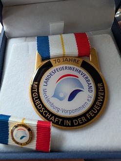 "Als Dank und Anerkennung verleiht der Landesfeuerwehrverband Mecklenburg-Vorpommern e.V. Hauptbrandmeister Hugo Dorendorf das Ehrenzeichen am Bande für 70 jährige Mitgliedschaft in der Feuerwehr".