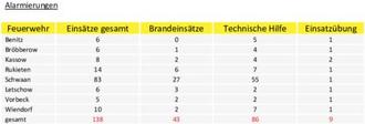 Die Feuerwehren des Amtes Schwaan wurden im Jahr 2025 insgesamt 138 Mal alarmiert. Davon entfallen 40 Alarmierungen auf Einsätze im Rahmen der nachbarlichen Löschhilfe sowie auf Übungen, bei denen mehrere Feuerwehren gleichzeitig oder überörtlich in anderen Gemeinden und Ämtern eingesetzt wurden. Somit ergeben sich für das Jahr 2025 insgesamt 98 Einsätze mit gemeldetem Schadensereignis im Amt Schwaan. Diese gliedern sich in 27 Brandeinsätze und 71 Einsätze der Technischen Hilfeleistung.