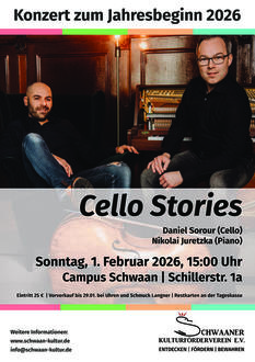 Cello Stories - Daniel Sorour, Violoncello, und Nikolai Juretzka, Klavier wählten den Titel, weil jedes Konzert mit Anekdoten und Geschichten zu den KomponistInnen und zu den Stücken frisch und offen moderiert wird. Bei den beiden Musikern klingen Popsongs wie Kammermusik und Barockstücke wie Pop. Für jeden spannend sind immer die kurzen Impros in den Jazzstandards aus New York oder Rio de Janeiro von Antonio Carlos Jobim oder Kenny Dorham (Blue Bossa) sowie George Gershwin. Mit bekannten klassischen Stücken und Filmmusiken der neueren Zeit schaffen die beiden noch mehr Abwechslung in das Programm. Im Repertoire finden sich unter anderem Werke von Coldplay, Einaudi, Piazzolla, Queen, Metallica, Nirvana, Pachelbel und vielen anderen.