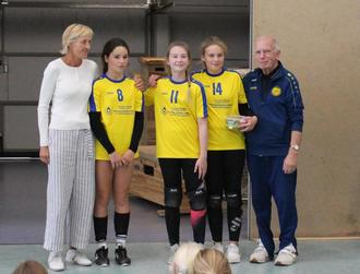 Einen super Erfolg feierten unsere 11 jährigen Mädchen der Spielgemeinschaft Schwaaner SV / PSV Rostock. Von 9 angereisten Mannschaften erspielte sich unser Team in der Vorrunde gegen Schwerin und SV Warnemünde den 1. Platz und sicherte sich damit die Spiele um Platz 1 bis 3! Dies gelang sehr souverän und mit konstanter Leistung mit jeweils 2 : 0 Siegen über Schwerin (11 und 14 Punkte) und dem SV Warnemünde ( 21 und 16 Punkte). Scarlett (Schwaaner SV), Mathilda (PSV Rostock) und Isabella (PSV Rostock) überzeugten mit Aufgabenstärke und gezielten Angriffen und ließen sich die Führung gegen Schwerin 1 und 2 nicht aus der Hand nehmen. Im Finale wurde es dann plötzlich ganz laut auf der Schweriner Seite. Da alle 4 Schweriner Teams ihre Spielerinnen anfeuerten. Das führte dann zu einem Punkteausgleich. Aber mit Nervenstärke und Konzentration gewannen wir dann doch den Satz mit 25 zu 22 Punkten! Mit dieser Einstellung zogen unsere Mädels dann im letzten Satz unaufhaltsam zum 25 zu 12 davon. Die Schwerinerinnen wussten nicht wie ihnen geschah und reihten einen Fehler an den anderen. Sie kämpften willensstark und zeigten ihr spielerisches Können! Aber unser grandioses Team konnte einen klaren Sieg zum Stolz ihrer Trainer Dieter Noberat und Ulrike Mehlberg und ihrer Eltern und Verwandten Schwaan und Rostock holen!