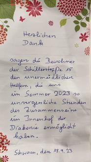 Zum Abschluss des Grillnachmittags erhielten die Mitarbeiter der Sozialstation ein großes Dankeschön und viele herzliche Worte. Diese Geste unterstrich die Wertschätzung und Dankbarkeit der Bewohner für die gemeinsame Zeit.