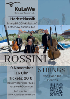 Nicht nur die Zusammenstellung der Instrumente der Rossini-Strings entspricht keinem originären Streichquartett, sondern auch das Repertoire ist mit Musik von Bach bis zu den Beatles nicht auf klassische Musik festgelegt, sondern umfasst alle Stile vom Barock bis zur Gegenwart. Die vier Instrumentalisten haben an Hochschulen ihrer Heimatländer, Polen, Rumänien und Deutschland, studiert. Erfolgreich nahmen sie an mehreren europäischen Musikwettbewerben teil. Bevor sie Mitglieder der Norddeutschen Philharmonie in Rostock wurden, waren sie in Orchestern von Bukarest, Lyon, Leipzig und Freiburg engagiert. Zum Rossini String Quartett schlossen sich die vier Musiker 2007 zusammen. Am Sonntag, dem 9. November um 16:00 Uhr lädt die Kultur-Land-Werkstatt zu einem Konzert in die Galerie des Schelpbrook-Kulturhofes ein. Wir freuen uns auf Ihren Besuch.