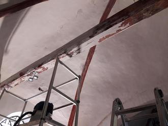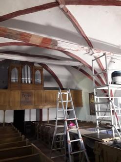 Jahrzehntelang überdeckten mehrere Schichten weißer Leimfarbe die wirkungsvolle Farbwirkung der Balkenbemalung im Kirchenschiff, die im Zuge der Umgestaltung der Kirche in der 2. Hälfte des 19. Jahrhunderts aufgebracht worden war.