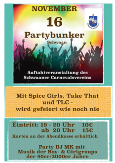 Am Samstag den 16.11.2024 lädt unser amtierendes Königspaar König Matthias und seine Miss Martina die Schwaaner Narren in den Partybunker ein, wo ab 20:11 Uhr die Faschingsparty unter dem Motto „Mit Spice Girls, Take That und TLC – wird gefeiert wie noch nie“ stattfindet. Zusätzlich ermitteln wir unser neues Königspaar, welches das Motto der 43. Session enthüllen wird.