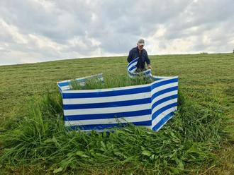 Wir arbeiten mit der Livebildübertragung, d.h. die Drohne liefert permanent Wärmebilder von einer Wärmebildkamera an unseren Technikanhänger, auf die Videobrillen der Läufer und an den Monitor des Quads. Wurde ein relevanter Wärmepunkt entdeckt, bleibt die Drohne einen kurzen Moment über dem Fundort stehen bis der Quadfahrer oder ein Läufer die Stelle erreicht hat. Dann wird geprüft, ob es sich wirklich um ein Rehkitz handelt. Im Falle eines Rehkitzes (aber auch beispielsweise beim Fund eines Eiergeleges von Wiesenbrütern oder Junghasen), wird ein Fähnchen gesteckt. Danach fliegt die Drohne unverzüglich weiter und einer der Helfer beginnt das Tier mit einem Windschütz zu sichern. Die modifizierten Windschütze haben sich absolut bewährt, denn sie sichern die Jungtiere sehr gut. Die Tiere werden nicht beunruhigt und gestresst, da sie an Ort und Stelle liegen bleiben können. Beim Einsammeln und Wegtragen von Kitzen wäre die Gefahr groß, dass menschliche Gerüche auf die Kitze übertragen werden. Nach der Mahd werden die Windschütze unverzüglich abgebaut und die Ricken laufen wieder zu ihrem Nachwuchs.