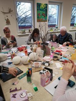 Passend zur Jahreszeit und zu den Festen locken wir mit kreativen Angeboten. Hier sind bunte Anhänger für den Osterstrauch und dekorative riesengroße Ostereier entstanden. Hauptsächlich wird mit Papier und Farbe gearbeitet. Alle 14 Tage dienstags haben hier die Erwachsenen Bastelliebhaber Zeit und Raum für gemeinsame Aktivitäten. Kaffee und Kuchen sind der krönende Abschluss an diesen Nachmittagen.