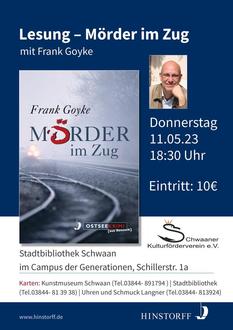 In Schwaan liest Frank Goyke aus seinem Roman Mörder im Zug (Rostock 2011). Der Verlag stellt Bücher zum Verkauf und Signieren zur Verfügung!