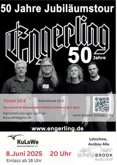Irgendwie passten Engerling in all den Jahren nirgends so recht ins Konzept und haben es doch geschafft, sich selbst und ihrem Publikum treu zu bleiben. Den DDR-Kulturfunktionären schien die Band um den Pianisten und Songwriter Wolfram Bodag als Blues-Band zu weit weg vom Idealbild des liedhaften Rock. Blues-Puristen dagegen kritisierten die mangelnde Authentizität einer Blues-Band, die sich um die Einhaltung des originalen Zwölf-Takt-Schemas wenig scherte und stattdessen Blueselemente nach Belieben mit Rock- und Soulelementen vermengte oder sich gar in lange Improvisationen verstieg, die viel eher ins psychedelische Flower-Power-Lager gepasst hätten. Seit 50 Jahren feilt die Ost-Formation nun beharrlich an ihrem eigenen Stil mit intelligenten Texten im Grenzbereich zwischen Deutschrock und eben doch Blues und hat sich damit ein treues, aber ganz und gar nicht „ostalgisches" Publikum erspielt. Und natürlich muss dieses Jubiläum auch gebührend bei uns gewürdigt werden. Wir feiern gemeinsam mit Ihnen auf dem Schelpbrook-Kulturhof am Pfingstsamstag ab 20:00 Uhr das fünfzigjährige Bühnenjubiläum von Engerling.