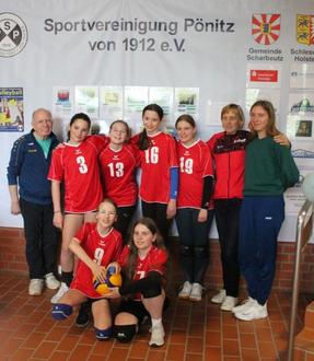 Am Wochenende war der Höhepunkt unserer jüngsten Volleyballerinnen im Schleswig Holsteiner Pönitz. Die Spielgemeinschaft Schwaaner SV/ PSV Rostock fuhr zur Norddeutschen Meisterschaft, welche hier noch Spielfest genannt wird, nachdem sie in der Landesmeisterschaft noch den 2.Platz nach dem Schweriner SC belegten. Dieter sagte dies sollte für die U 13Mädchen ein einmaliges Erlebnis sein. Nach würdiger Eröffnung mit Einlauf und Livemusik wurden die Vorrunden mit 12 Teams in 3 Staffeln gespielt. Hier konnten sich unsere Mädchen mit 3 Siegen gegen