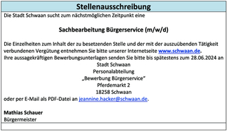 Die Stadt Schwaan sucht zum nächstmöglichen Zeitpunkt eine