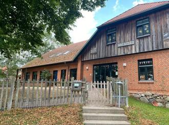 Vor dem Haus gibt es einen kleinen Spielplatz. Das naturbelassene Außengelände lädt zum Spielen, Erkunden und Bewegen ein. Ein Bachlauf bietet an wärmeren Tagen einen willkommenen Anziehungspunkt für Wasserspiele. Ein Lehmbackofen im Außenbereich steht für kulinarische Backfeste zur Verfügung.