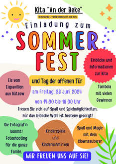 Aber wie heißt es immer so schön: „Nach dem Fest ist vor dem Fest.“ Am 28. Juni findet von 14:30 bis 18:00 Uhr für die Kinder und deren Familien in unserer Einrichtung das diesjährige Sommerfest statt. Aber das Besondere in diesem Jahr ist, dass wir die Türen für alle öffnen und zu einem „Tag der offenen Tür“ einladen. Interessierte Eltern, Kinder und Familien sind herzlich eingeladen und können sich einen Einblick verschaffen. Aber auch ehemalige Weggefährten können unserer Einrichtung einen Besuch abstatten und gucken, was sich verändert hat. An diesem Tag stehen viele Angebote, wie Kinderschminken und Kinderspiele bereit. Für das leibliche Wohl ist in herzhafter und süßer Weise zum kleinen Preis gesorgt. Schauen Sie gerne vorbei.