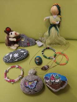 Mandy Wille arbeitet mit Naturmaterialien. Dabei entstehen bemalte Steine, verzierte Holzscheiben, Filzfiguren und Schmuck aus Kieselsteinen, Seeglas und Draht.