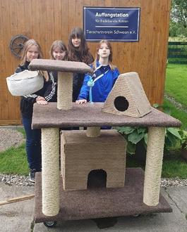 Die Mädchen hatten im Rahmen eines Projektes im Juni den Bau eines Kratzbaumes für den Tierschutz geplant. Bei der Umsetzung ihres Projektes wurden die vier Schülerinnen der 7. Klasse von zwei Betreuern begleitet. Dabei entstand auch eine Projektmappe in zwei Sprachen, die als Anleitung den Nachbau dieses Kratzbaumes ermöglicht. Mit viel Elan und Freude fertigten dann die Mädchen in den Projektstunden diesen Kratzbaum für Katzen mit viel handwerklichem Geschick an und entschieden sich, mit ihrem aufwändig angefertigten Kratzbaum den Tierschutzverein Schwaan in seiner Auffangstation für freilebende Katzen zu unterstützen. Einige Katzen haben den Kratzbaum schon getestet und er wird in einem Katzenhaus nicht nur zum Hingucker werden, sondern auch zum Lieblingsplatz für viele Katzen. Dafür geht ein herzliches Dankeschön an die vier Schülerinnen!