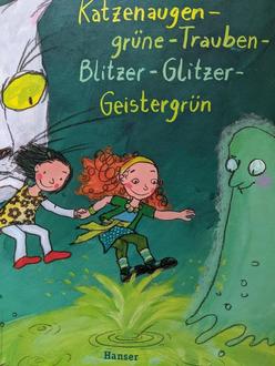In der Geschichte „Katzenaugen-grüne-Trauben-Blitzer-Glitzer-Geistergrün“ von Tanja Dückers findet Lara heraus, dass es in echt viele Rots, Blaus und Grüns gibt.