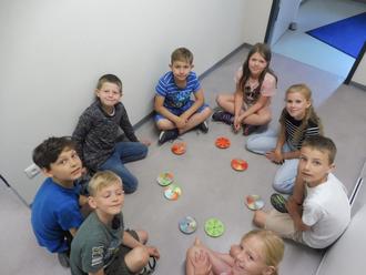 Ein eigenes Farbenspiel gestaltete jede Schülerin und jeder Schüler im Anschluss an die Lesung. Viele kleine, farbige Tortenstücke wurden auf eine Scheibe geklebt und danach in Bewegung versetzt.