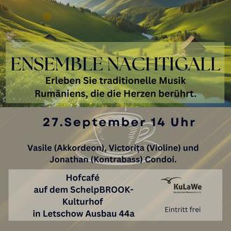 Vor dem gesellschaftspolitischen Wandel galt Rumänien in unserem Land als ein bevorzugtes Urlaubsziel. Es erfüllte alle Voraussetzungen für einen erlebnisreichen Urlaub. Berge, Schwarzes Meer, Bären und Pelikane und nicht alltägliche Speisen lieferten die Grundlage für eine unvergessliche Zeit. Diese Tage sind schon lange Vergangenheit und die aktuellen Urlaubsziele liegen in Ländern, die zuvor unerreichbar waren. Mit dem Auftritt der rumänischen Folkloregruppe „Ensemble Nachtigall“ möchte die Kultur-Land-Werkstatt am Samstag, den 27. September, ab 14:00 Uhr südosteuropäisches Flair in das Café auf dem Schelpbrookhof bringen. Vielleicht haben auch Sie rumänische Urlaubserlebnisse, an die Sie sich dann bei den leckeren Torten des Cafés gerne erinnern mögen.