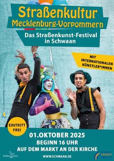 Am Mittwoch, den 1. Oktober 2025, verwandelt sich die Schwaaner Innenstadt erneut in eine bunte Bühne für kreative Talente. Das Fest wird auch in diesem Jahr weiterentwickelt und bietet zahlreiche neue Programmpunkt, zusammen mit der Küstenkultur und der Kunstschule Rostock. Wie gewohnt dürfen sich die Besucherinnen und Besucher auf außergewöhnliche Straßenkünstler freuen, die mit ihren Auftritten für Staunen und beste Unterhaltung sorgen. Die Kunstschule Rostock sorgt mit vielfältigen Mitmachaktionen für kreative Highlights beim Fest. Für das leibliche Wohl sorgen die Mitglieder des Gewerbestammtisches Schwaan und die Pegasus Agentur. Freuen Sie sich auf einen fröhlichen Nachmittag voller Kunst, Kreativität und Begegnungen für die ganze Familie!