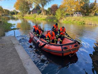 Ebenfalls an der Elde standen Mathias Vossen (Stv. Wehrführer FF Eldena) und Christian Wilke (Jugendwart FF Eldena) mit dem Schlauchboot und Leinen bereit. Aufgabe war es, mit dem Boot zur anderen Uferseite zu gelangen und dort korrekte Knoten zu binden.