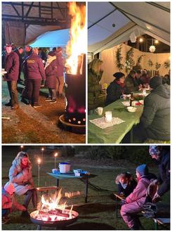 Dieses Mal lud Familie Markwart die Dorfgemeinde auf ihren Hof ein, den sie mit viel Liebe adventlich geschmückt hatten. Ob im Zelt oder unter freiem Sternenhimmel, Erbsensuppe und Soljanka schmeckten ebenso wie Glühwein und Bier oder auch Tee und Kinderpunsch. Das alles wärmte die Gemüter von innen. So liebt man es in der Vor- und Weihnachtszeit. Ein bisschen Kälte von außen und Wärme von innen. Das gibt ein heimeliges Gefühl. Wer dennoch kalte Hände oder Füße bekam, der rückte einfach näher an die Feuertonne. Den Kindern wurde es sicher nicht kalt, denn die konnten durch den Hof toben und sich dann mit einem Stockbrot am Lagerfeuer für die nächste Runde stärken.