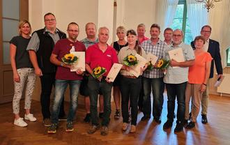 Ehrennadel 20 Jahre (v. l. n. r.): Patricia Steckel, René Möller, Andreas Baalke, Thomas Bach, Karsten Grimm, Anja Bartels, Dorit Wolf, Jürgen Hildebrandt, Volker Meier, Ulf Riechert, Thomas Pientka, Kriemhild Kant und Guido Tiedemann