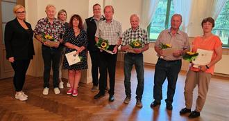 Ehrennadel 30 Jahre (v. l. n. r.): Carina Stopsack-Sternberg, Konrad Schmidt, Patricia Steckel, Heike Bartczak, René Möller, Berthold Böttcher, Bodo Döring, Reinhard Witkowski und Kriemhild Kant