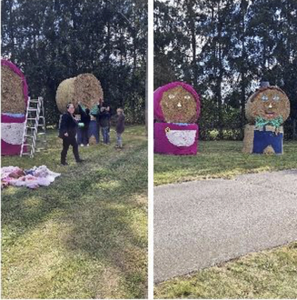 | - | Dann das Schmücken der Strohfiguren. Um die Puppen kümmerten sich Anja, Kathleen, Steffi, Bianka und Christine. Lars und Stefan bauten eine Kuh, die dieses Jahr auf der Festwiese liegen wird. |