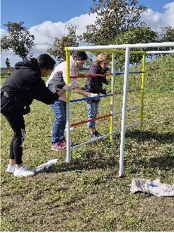 | - | Der neue Anstrich für die Spielgeräte aus DDR-Zeiten durch Wencke, Bianka und Christine. Hartwig hatte vorher tagelang die alte Farbe abgeschliffen. Einige Erinnerungen kamen wieder zum Vorschein, denn einige Helfer turnten selbst an den Geräten zu Kindeszeiten darauf rum. |