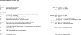 | 07. + 08. und 14. + 15. | Adventskonzerte in Balow (Kartenverkauf unter www.gemeinde-balow.de) |