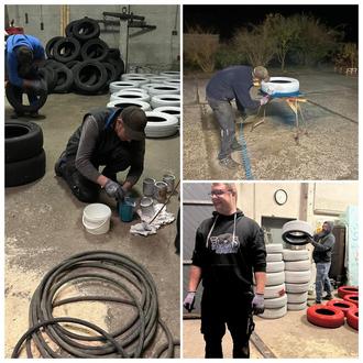 Am folgenden Samstag wurden alle Reifen gesäubert und gebohrt um das Wasser aus den Reifen zu bekommen. Danach wurden sie alle einzeln in der Garage zum Trocknen ausgelegt von Rudi, Stocki und Heiko. à Wie kriegen wir die Reifen gestrichen? - War nun die Frage