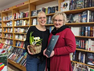 Zwei Lesebegeisterte in der Buchhandlung "Theodor Körner": Bürgermeisterin Kathleen Bartels nebst Inhaberin Astrid Hecht