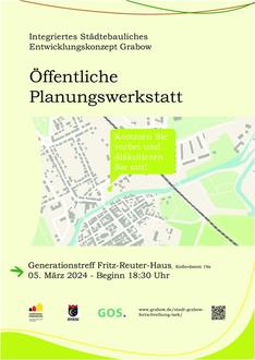Kommen Sie zur Planungswerkstatt am 5. März um 18:30 Uhr im Generationstreff Fritz-Reuter-Haus und bringen Sie Ihre Ideen zur Entwicklung der drei Gebiete mit ein. Alle Bürgerinnen, Bürger und lokalen Akteure sind herzlich eingeladen! Sie haben dort die Möglichkeit mit den Mitarbeitenden der GOS zu sprechen und gemeinsam Stärken, Defizite und Lösungsideen zu finden. Die GOS ist mit der Fortschreibung des Integrierten Städtebaulichen Entwicklungskonzepts (kurz ISEK) beauftragt, das Grundlage der zukünftigen Stadtentwicklung in Grabow ist.