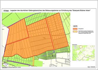 Mit dem Aufstellungsbeschluss des Bebauungsplanes „Bürgersolarpark Büdner Acker“ vom 14.07.2023, wurde das städtebauliche Planungsverfahren zur Errichtung und zum Betrieb einer Photovoltaikanlage auf Flächen nordwestlich des Ortsteils Prislich begonnen.